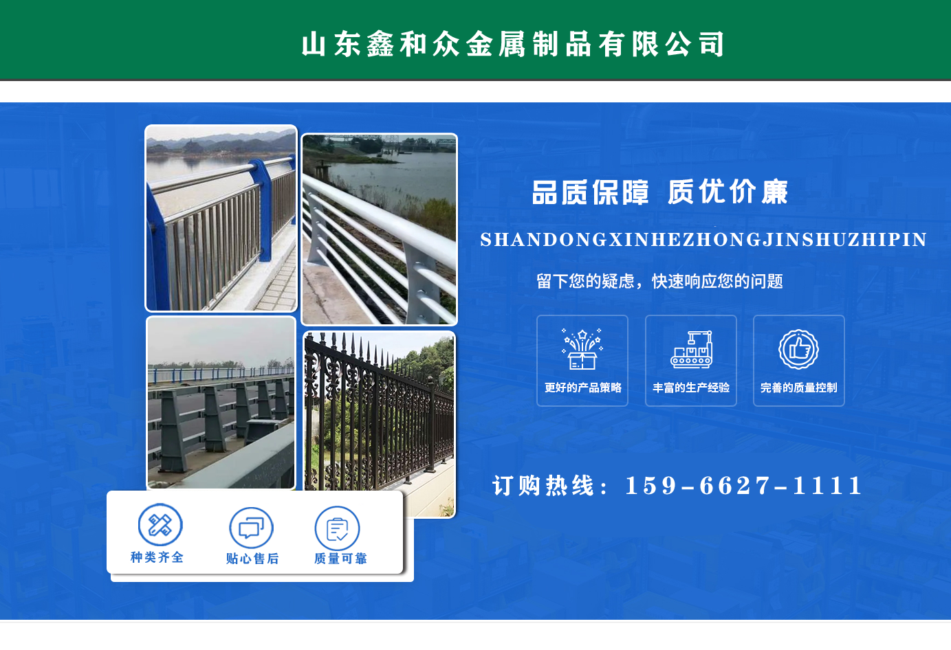 山东鑫和众金属制品有限公司主要产品有防撞护栏,桥梁护栏,道路护栏,河道护栏,不锈钢护栏等护栏。提供设计方案,一站式定制,包您满意价格优惠,欢迎来电咨询! 公司常年从事销售护栏防撞护栏,桥梁护栏,道路护栏,河道护栏,不锈钢护栏,桥梁钢护栏,河道灯光护栏等。产品广泛应用于桥梁、河道、旅游景区、道路、公路、公园、小区、景观、道路防撞等领域?! 」静肪捎糜胖什恍飧植牧?,符合相关标准。各种型号不锈钢复合管及护栏,质量严格把控。产品强度高、耐腐蚀、焊接牢固、抗冲击、性能好,防撞护栏结构简单、美观实用大方?! 』队袄炊┕?!...